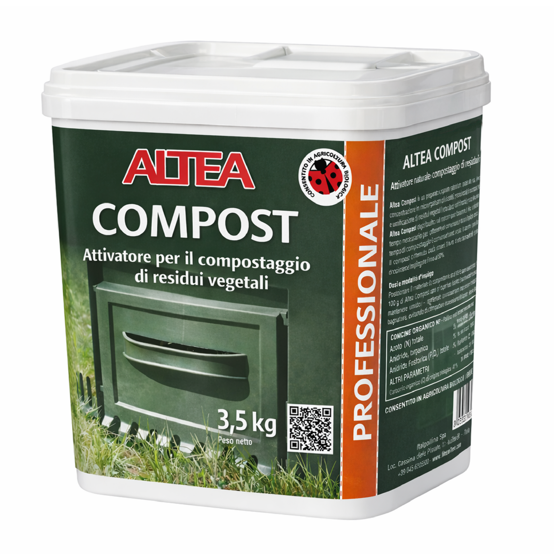 Altea compost è un esclusivo preparato granulare naturale, che, oltre ad apportare una elevata concentrazione di microrganismi, in grado di accelerare i processi naturali di decomposizione e umificazione dei residui vegetali (erba, scarti di potatura, scarti di cucina) e materiale cartaceo, apporta anche azoto e fosforo organici che migliorano la qualità ed il valore nutrizionale del compost prodotto. Distribuito sul materiale da compostare, consente di ridurre drasticamente il tempo necessario per ottenere un compost di qualità.